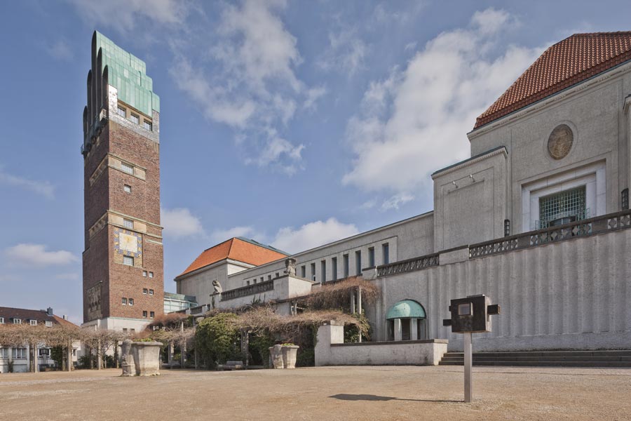 Ein besonderes Ensemble auf der Mathildenhöhe Darmstadt: Die Kunsthalle Marcel Duchamp vor dem Hochzeitsturm und Ausstellungsgebäude. Foto: Gregor Schuster