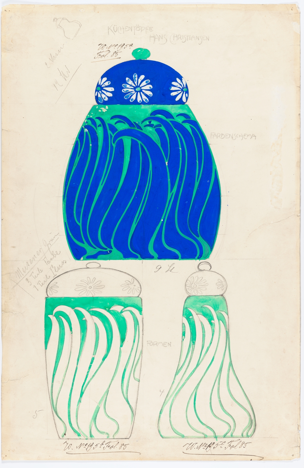 Hans Christiansen, Entwurf für 3 Deckelvasen mit Margeritendekor und blauen Blättern auf grünem Fond, 1901, Institut Mathildenhöhe, Städtische Kunstsammlung Darmstadt, Dauerleihgabe der Sparkassen-Kulturstiftung Hessen-Thüringen, Frankfurt am Main, Foto: Gregor Schuster