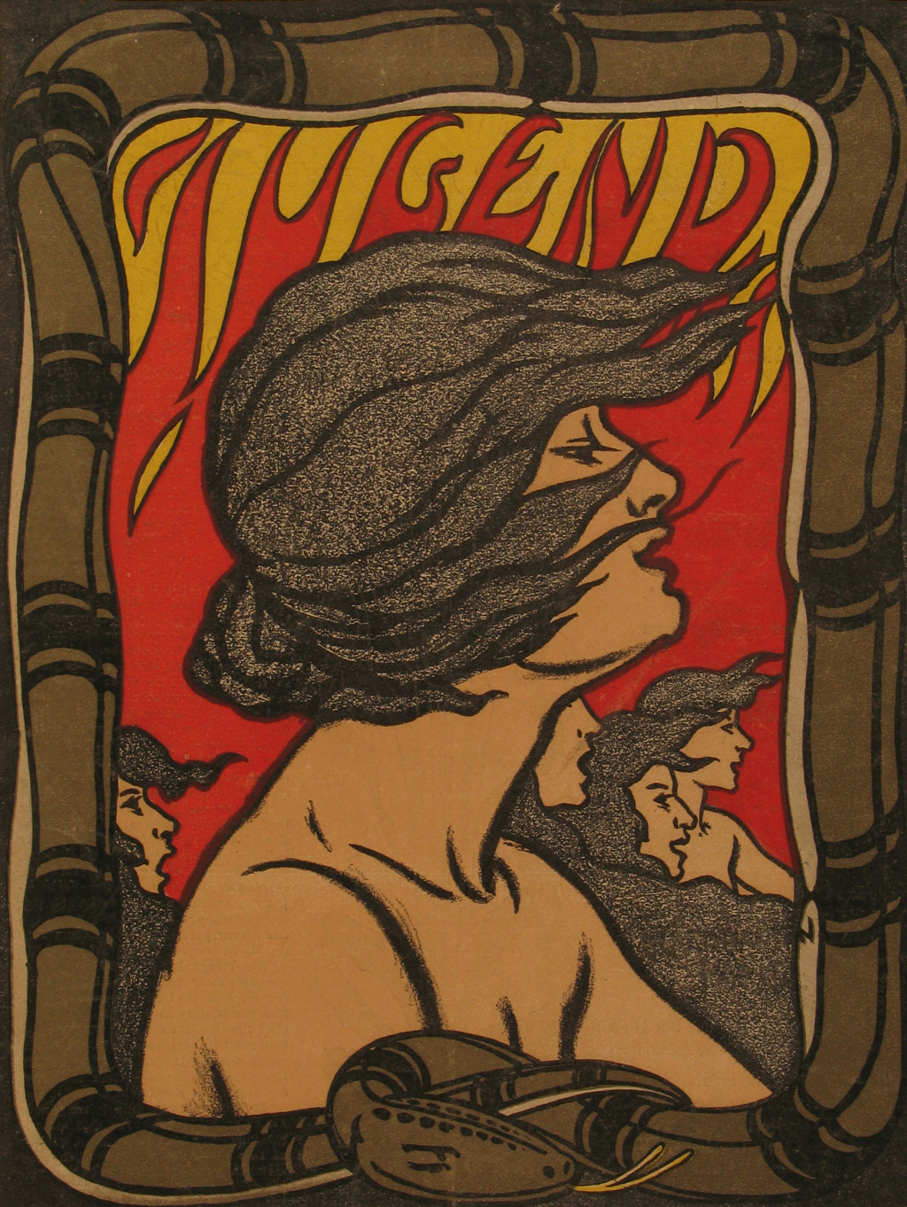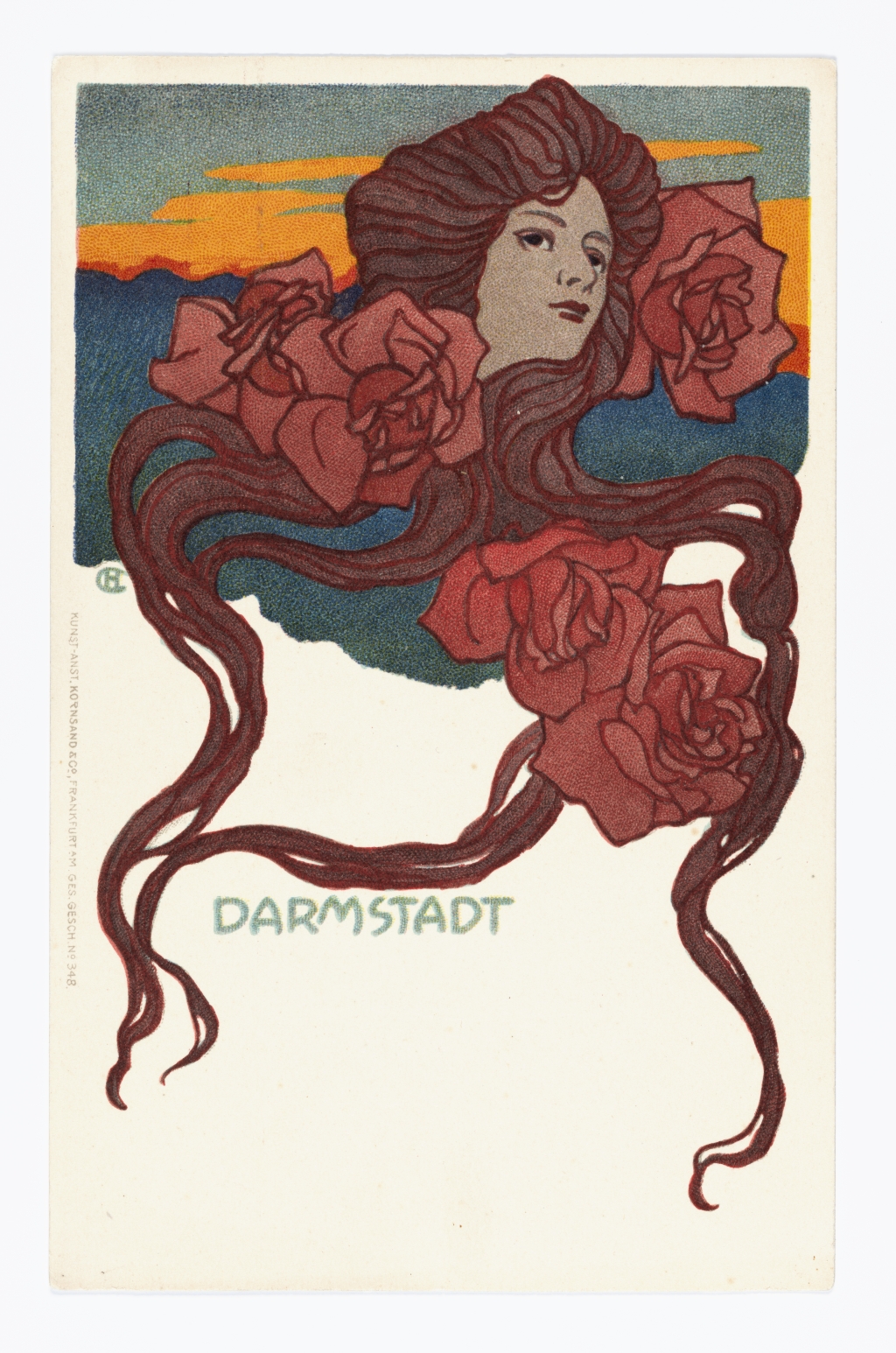 Hans Christiansen, Frauenkopf mit Schlängelhaar und Rosen, um 1901, Postkarte, Institut Mathildenhöhe, Städtische Kunstsammlung Darmstadt, Foto: Gregor Schuster