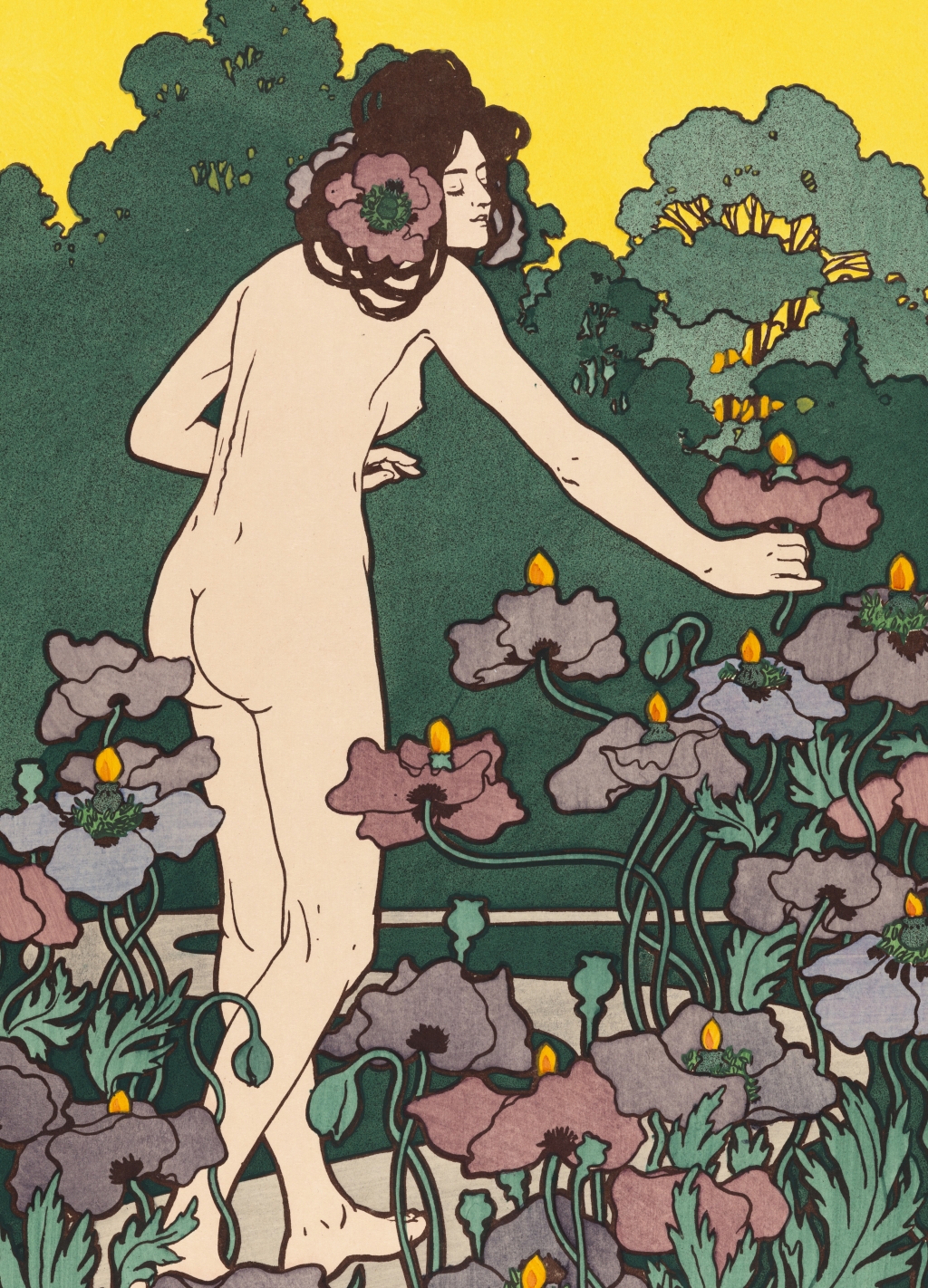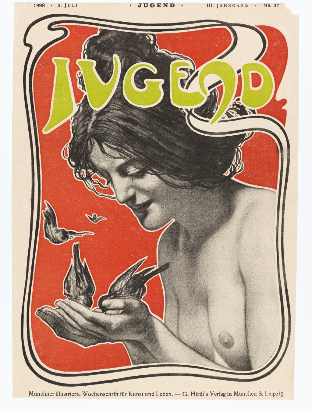 Hans Christiansen, Junge Frau mit Vögeln, Titelblatt der „Jugend“, 1898, Institut Mathildenhöhe, Städtische Kunstsammlung Darmstadt