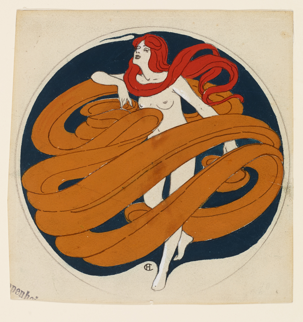 Hans Christiansen, Frauenakt mit schwingendem Schleier in Kreisschreibe, Entwurf für eine Bonbonniere, 1898/1899, Museumsberg Flensburg